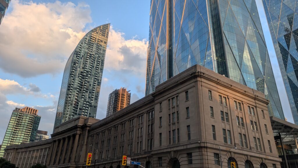 建築はボザール様式。後ろにそびえ立つ近代建築のビル群に全く引けを取らない存在感!トロントを「美しく、機能的な都市」にするという当時の都市計画運動の一環として建設されたというだけあり、威風堂々とした雰囲気に圧倒されます。