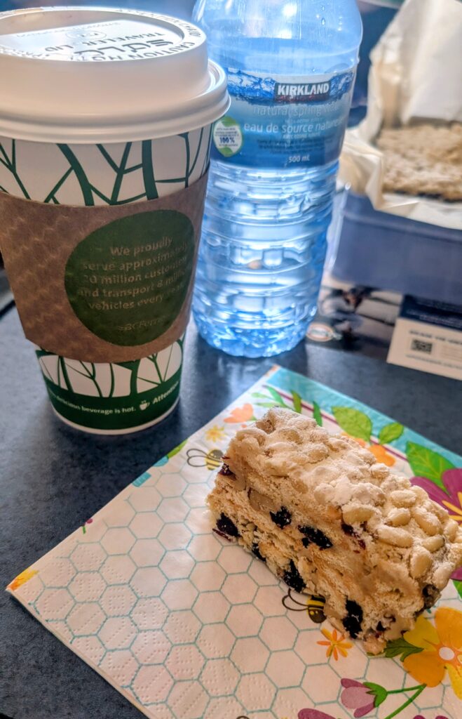 ターミナルで時間切れで買えなかったコーヒーでしたが、船内で買えました!カナダに来て思ったのが、カフェラテの美味しいこと!普段はブラックなんですが、ラテが美味しいことを確認したくて買う機会があればラテを注文してました。こちらのラテも美味しかった〜。一緒に写っているケーキは旅メンシスターのご家族が作ってくれたというケーキ。ケーキの名前は忘れてしまいましたが、こちらも美味しくて出だしから至れり尽くせり。