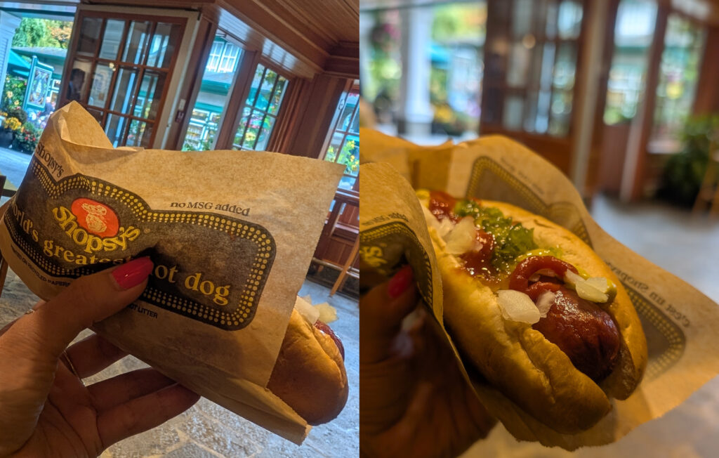 ガーデンの見学を終えた後は素敵なカフェでご飯を、という計画だったようなんですが、この日は貸切で入れなかった!計画を立ててくれていた娘さんはかなりガッカリされていましたが、ここでいただいたホットドックも美味しかったですよ〜!他の方が食べきれなかったサンドイッチやアイスクリームが私のところに巡ってきて、大満足なご飯になりました!
