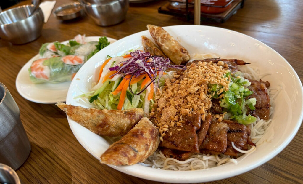 レモングラス風味のポークと春巻きの炭火焼き。この春巻きと野菜と豚肉の下にもりもりの麺!春雨?はたまたフォー?こちらはテーブルにある調味料をかけて食べたら激うまでした。