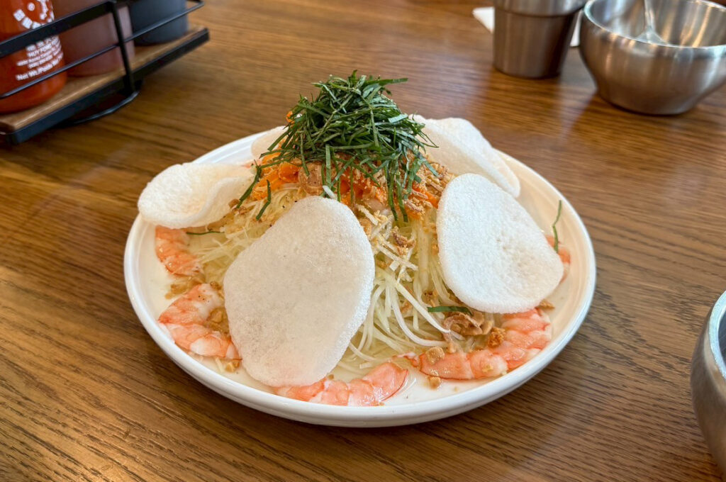 青パパイヤのサラダって普段は全く食べないけど、東南アジア料理で食べると美味しいなぁっていつも思う。シャキシャキ爽やかで、他の野菜に例えられないオリジナル感がある。