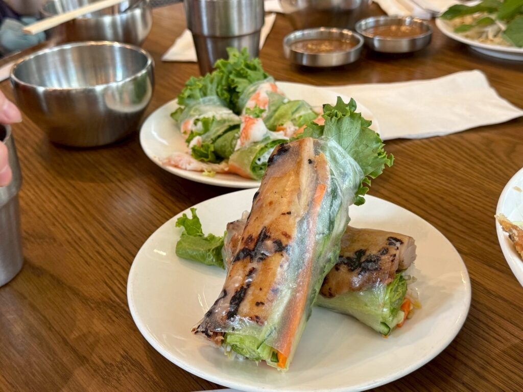 手前がグリルチキンの生春巻き、奥がエビの生春巻き。比べるものが何もないけど、日本で食べるベトナム料理屋さんの生春巻きを想像していたら、驚くほどでかい‼︎ベトナムではこれが標準サイズなのか、カナダに合わせたサイズなのか??シェアするのがなかなか大変だったけど、お肉も野菜もエビもモリモリ味わえて美味しかった!