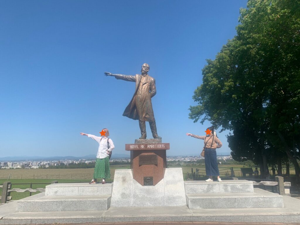 友達がクラークさんと写真を撮りたい!と言ったので羊ヶ丘展望台へ!友達とクラークさんのツーショットを撮っていたら「撮りましょうか?」と女の子に声をかけていただいたので、お言葉に甘えて私も参加。(白シャツ&緑のスカートが私)