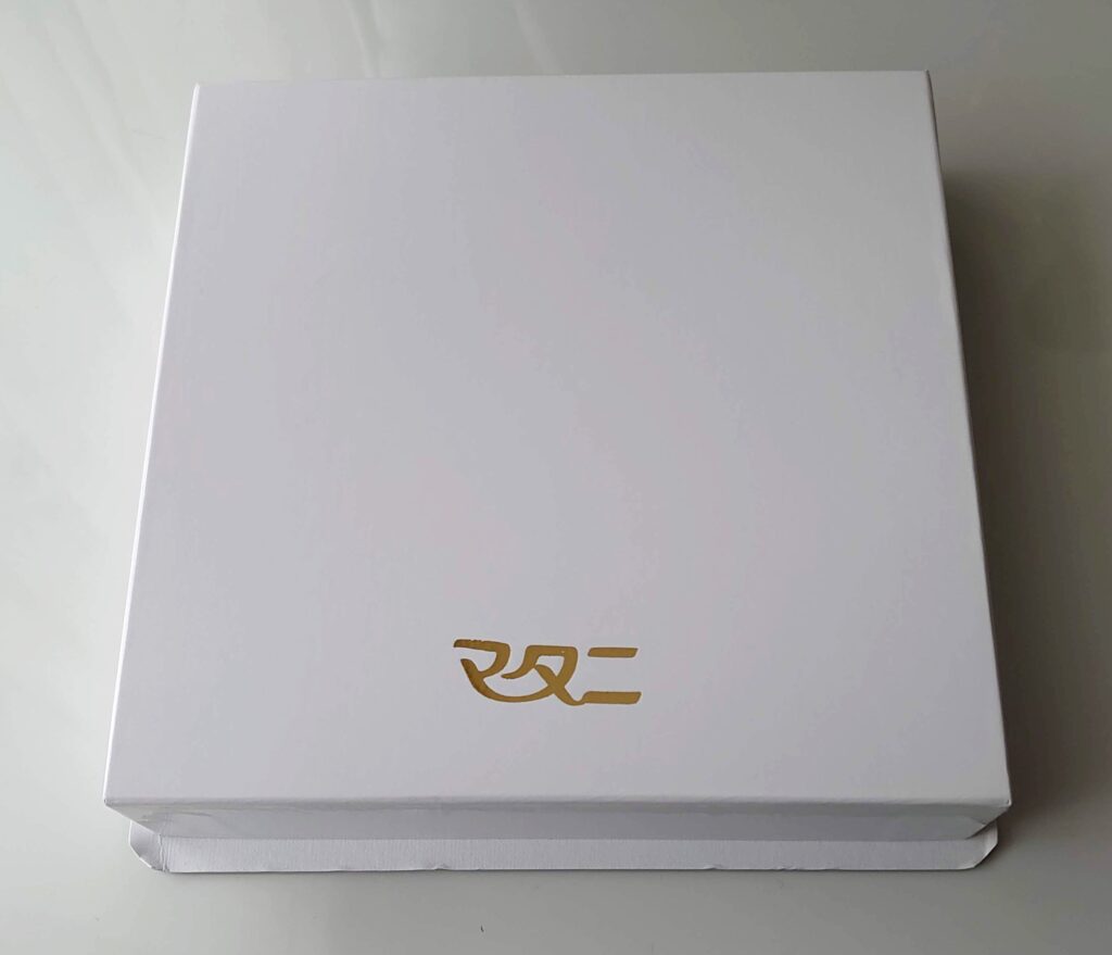 家に連れて帰って来たので、道中の負荷で箱が折れちゃったりもしてますが、この真っ白な箱にマタニの箔押し。